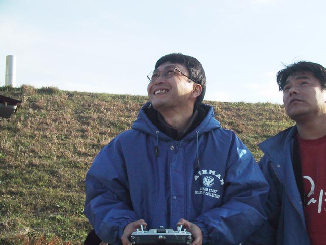 飛行機を飛ばしている私とにしもっちゃん。